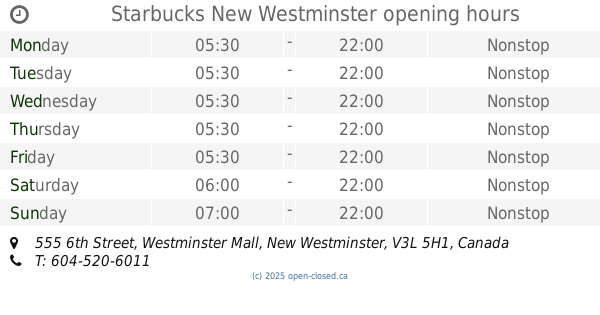 It is also possible to : Edit these OPENING HOURS of Restaurant Starbucks In New Westminster, 555 6th Street, Westminster Mall,